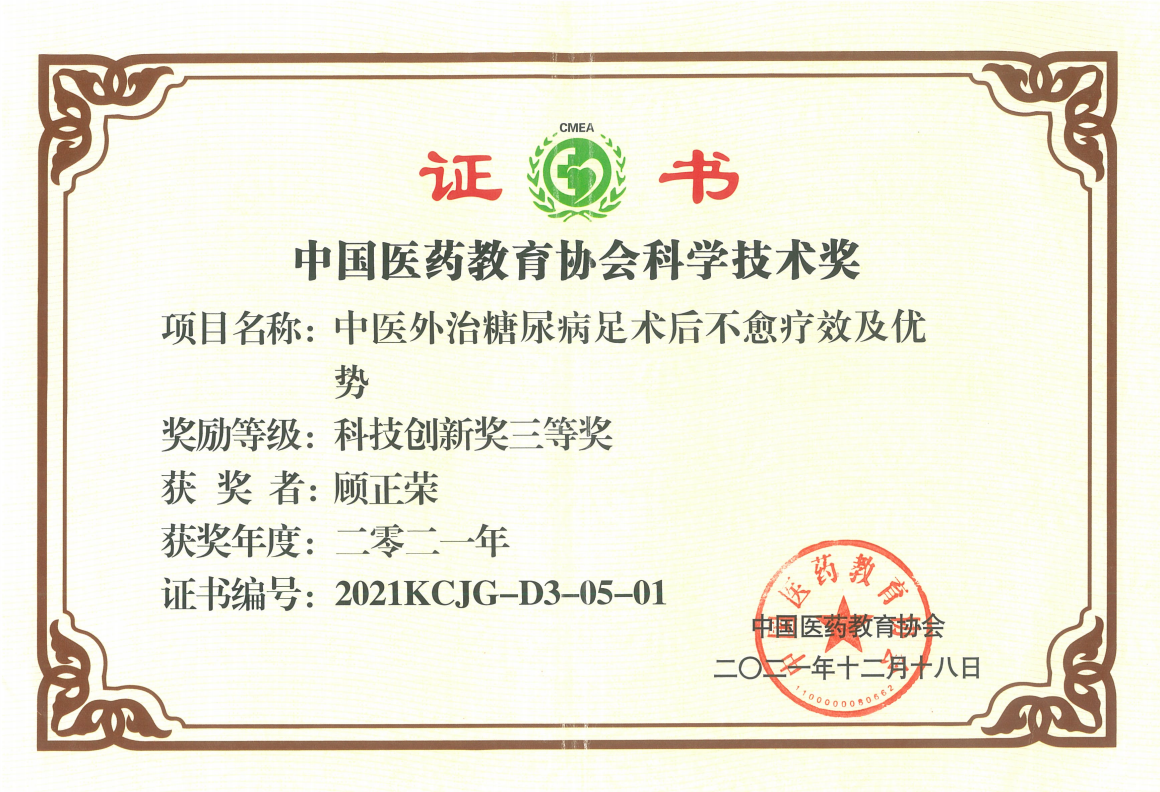 3、2021年度“中医药外治糖足术后不愈临床疗效优势”荣获中国医药教育协会科学技术创新奖三等奖;